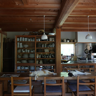 私たちとロクロを並べて、弟子たちが学びながら仕事をする工房、昼食を交代で作って食べたり、お茶を飲みながら他愛もない話を楽しむ食卓、窓から見える景色から季節の移ろいを感じ、猫たちが戯れる姿に心和ませながら暮らしを営む場所での、作品展を楽しんでいただければ幸いです。